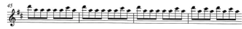 When people listen to music, they usually don’t attend to individual notes, but instead to sequences of notes that relate to each other harmonically, metrically, rhythmically, and by closeness of pitch. Bregman, in his book Auditory Scene Analysis, explains why listeners group notes together that are close in frequency, and separate pitches that are far apart. The following excerpt from Mozart’s Overture to The Marriage of Figaro is an example. The repeated notes are naturally separated from the isolated moving notes because of the distance that separates them in pitch space.
