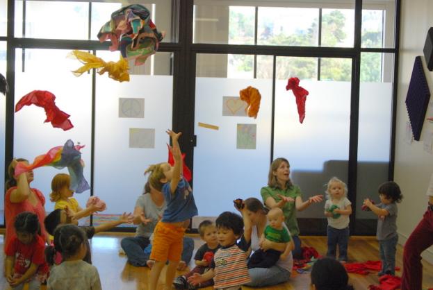 Parents and their children toss colorful scarves into the air at one of Charity Kahn’s dance and music classes.