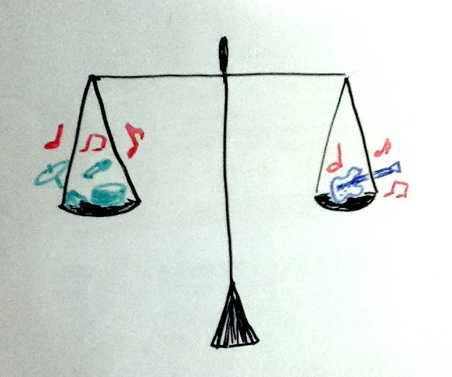 This misunderstanding occasionally happens with older students. Today, my sixth grade students were doing a eurhythmics activity, walking to the beat while bouncing, catching and tossing a ball, also to the beat. The music they were walking to was the first movement of Bach’s Brandenburg Concerto in F major. I played the opening bars first so they would become familiar with it, and demonstrated how to use the ball, and how to walk to the macro beat. The students then got to practice with the ball before using it to the music or walking. The micro beat pulse is relatively prominent, and this one student, attempting to walk to the beat, began walking to the micro beat, while her classmates all walked to the macro beat. She could not at first accommodate two notes within a single beat. The sixteenth notes did not present a problem, because they are not constant, and therefore cannot be a steady pulse. Training students in divisions of the beat forms the basis for accurate beat perception, meter perception, and rhythm performance. What follows are some activities that can be used for this purpose.
