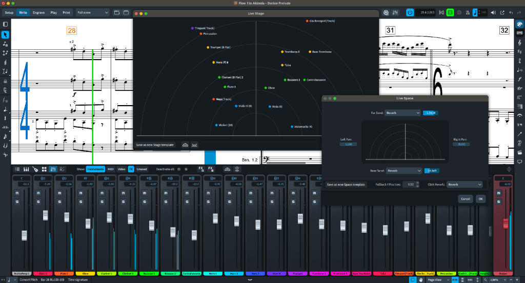 To edit how it all sounds, open the mixer window in play mode, where you’ll find faders, eq, effects, and more. Play mode is essentially a entry-level version of Cubase, with all the functionality of that sister application. You can also drag players to any position in the seating chart, and the playback will reflect where the player has been moved to: sound comes from the left or right and gets softer toward upstage, more present toward downstage. There are also modes for set-up, write, and engraving. Menus for everything possible with keyboard shortcuts is also available in convenient windows to the left and right of the main window, so if you can’t remember the shortcut, what you want is always a click or two away.