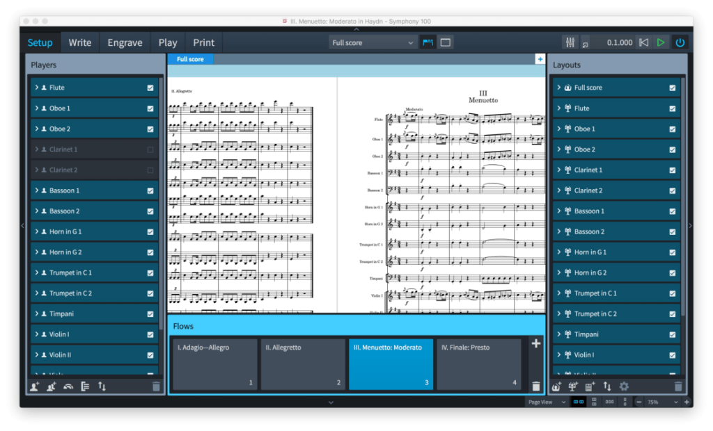 First, I like thinking of my score in terms of players instead of instruments. When you set up a new score, you assign each score staff to a player, solo or section. Solo players can double on other instruments, section players can’t. So right from the start, I’m constantly reminded I’m writing for a person, or group of persons. If I’m writing for solo players, as I am when writing chamber music, I simply choose an